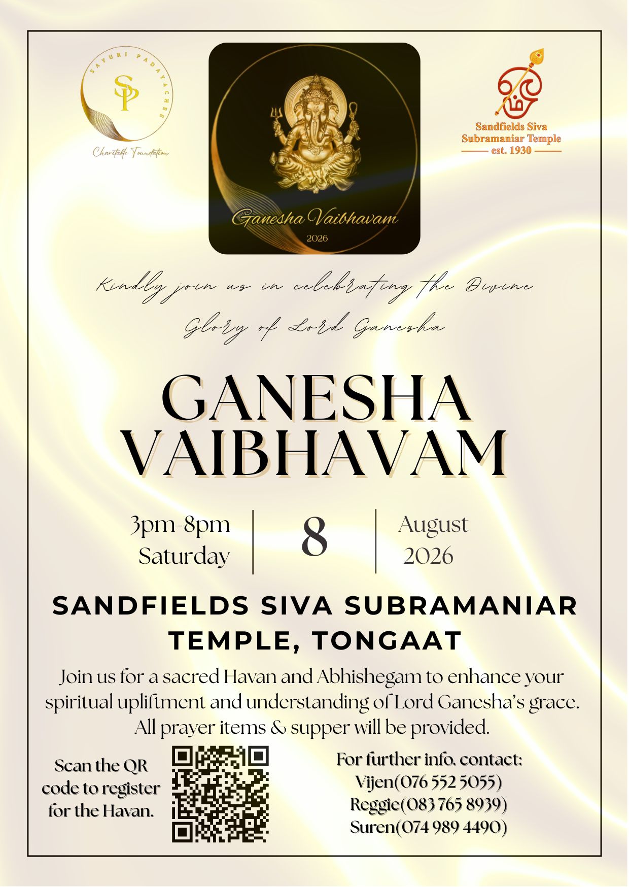To uphold the sanctity and spiritual focus of the Havan, we kindly request all devotees to be seated by 14:30 before the ritual begins at 15:00. Once the Havan has commenced, movement within the space may disturb the flow of energy and intention. As such, latecomers will not be able to participate directly in the Havan and will be guided to alternative seating to respectfully observe the proceedings.